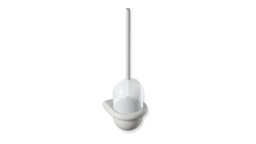 Bürstengriff mit auswechselbarem schwarzem Bürstenkopf aus Polyamid, Bürstentopf mit gewölbtem Boden und sphärenförmigem, teilweise offenem Oberteil in ringförmigem Halter, der Behälter ist herausnehmbar, kann aber auch diebstahlgeschützt montiert werden, diebstahlgeschützt durch verdeckte Verschraubung, 141 mm breit, 470 mm hoch und 140 mm tief, Halter, Bürstentopf und Bürstengriff aus hochwertigem Polyamid nach HEWI Farbtabelle, Oberteil aus transluzentem Kunststoff in Farbe weiß, inklusive korrosionsfreiem HEWI Befestigungsmaterial.