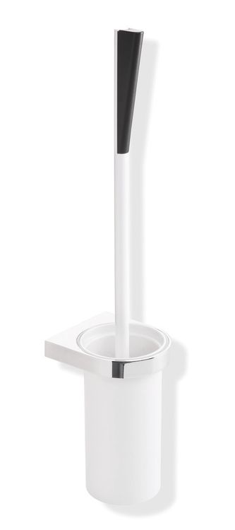 bestehend aus WC-Bürste, Bürstenbehälter und ringförmigem Wandhalter, 105 mm breit, 543 mm hoch und 120 mm tief, Halter aus Metall, hochwertig verchromt, zylindrischer Bürstenbehälter aus hochwertigem Polyamid, in HEWI Farbe 98 (Signalweiß), Bürste mit verlängertem Stiel, ergonomischem Griff und auswechselbarem Bürstenkopf, inklusive korrosionsfreiem HEWI Befestigungsmaterial.