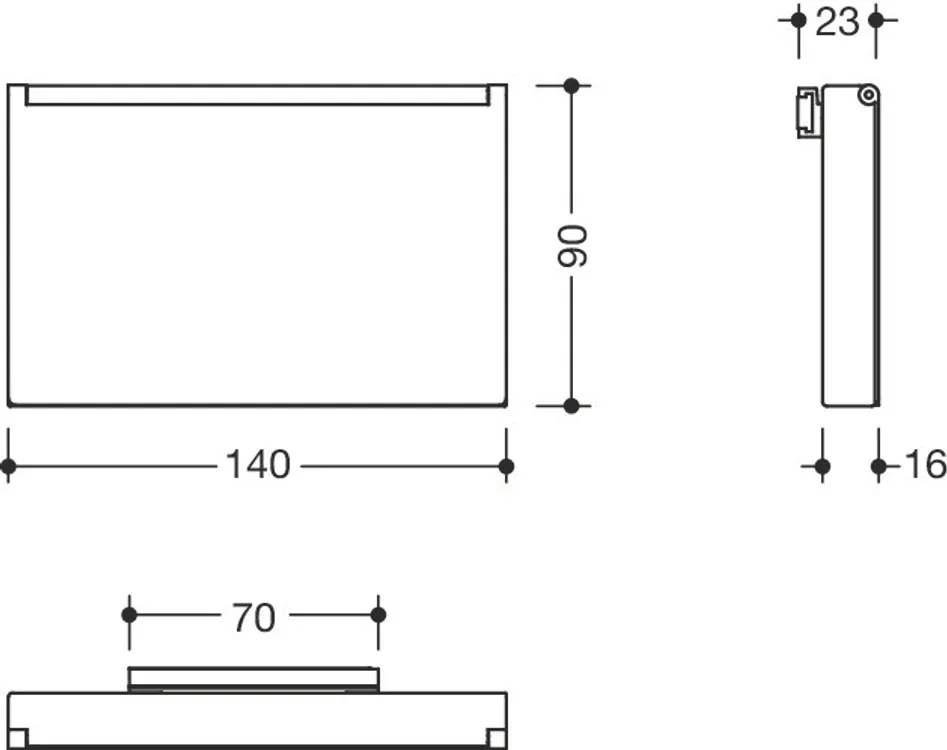 - 140 mm breit, 90 mm hoch, 23 mm tief