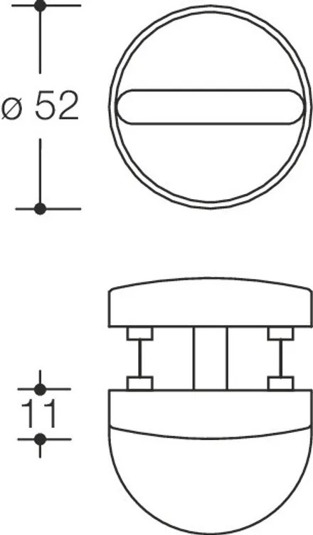 Rosettenunterkonstruktion aus Kunststoff, links und rechts verwendbar. Verdeckte Verschraubung. WC-Ausführung mit Notöffnung mittels Vierkantdorn oder Münze und Schauscheibe - Anzeige rot/weiß auf der Außenseite. Drehknauf auf der Innenseite.