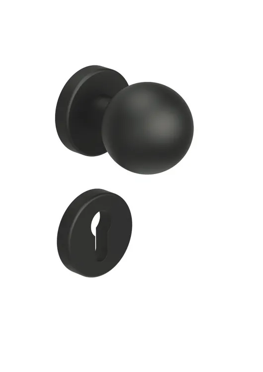 Mehr anzeigen in R-Technik nach DIN 18255 und DIN EN 1906 aus mattem Polyamid, bestehend aus: Knopf 123.23PBR und Türdrücker 111.23PBR, Durchmesser 23 mm und Rundrosetten 305.23PBR und 306.23PB.