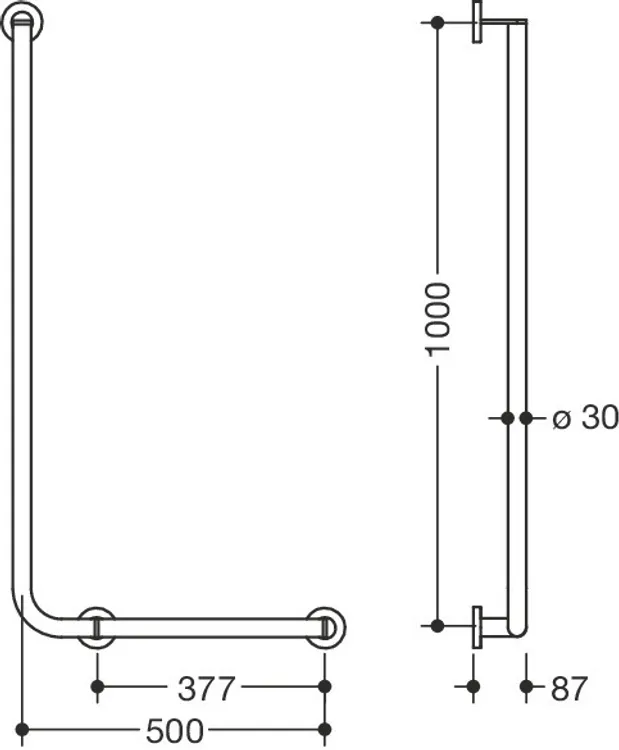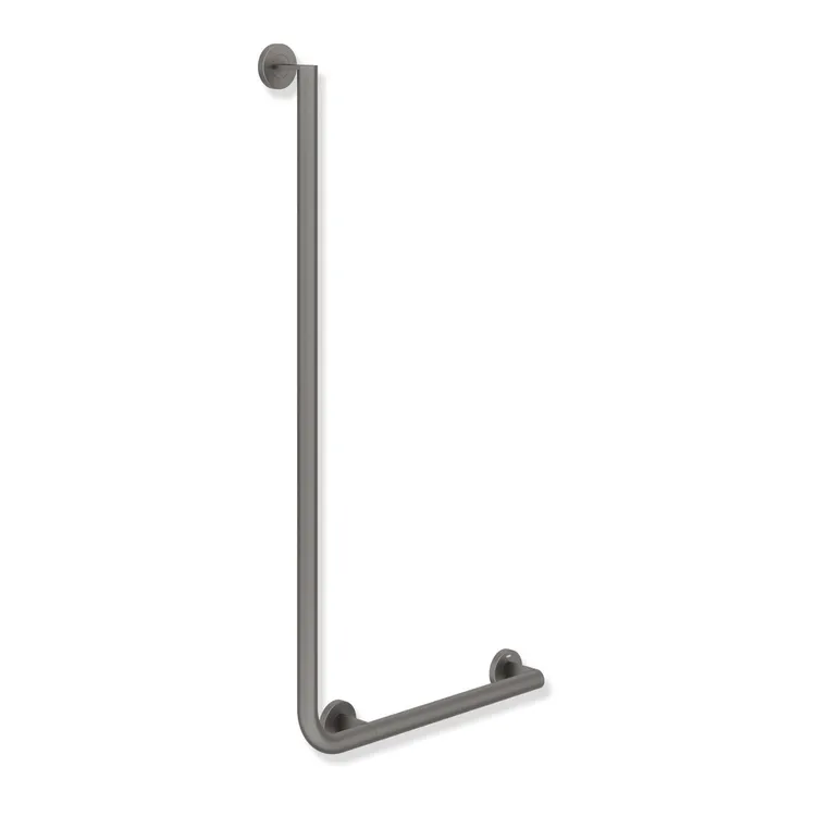Edelstahl, pulverbeschichtet, waagerechte Länge 500 mm, senkrechte Länge 1000 mm, Durchmesser 30 mm, Ausführung rechts, getestet bis 200 kg bei Verwendung mit HEWI Befestigungsmaterial, empfohlenes maximales Gewicht des Anwenders: 150 kg, erfüllt die Anforderungen nach SIA 500.