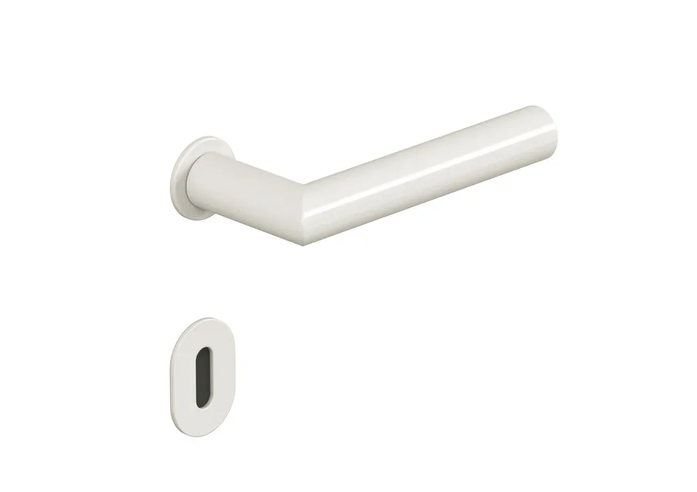 Türdrücker Modell 162.21PCM in Gehrungsform aus Polyamid mit durchgehendem Stahlkern bis in das Drückerende, durchgängig eingefärbt, Durchmesser 21,3 mm, mit Ansatzführung. Vierkantstift des Drückerstiftteiles 8 mm mit Trapezgewinde, für Österreich Vierkantstift im Schlossbereich 8,5 mm mit Trapezgewinde.