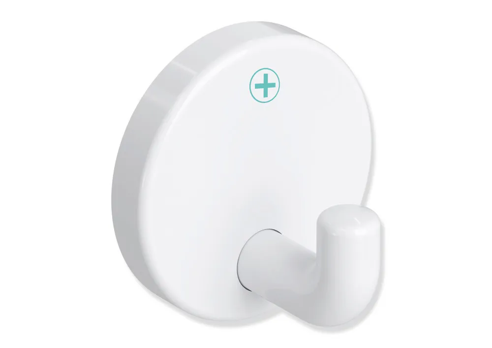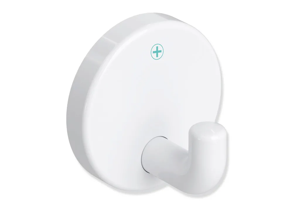 Show more right-angled bend, cylindrical hook with fixing rose, anti-theft protection through concealed screw fixing, 30 mm deep, rose diameter 40 mm, made of high-quality polyamide in HEWI colour 98 (signal white), with active antimicrobial microsilver, supplied without screws and plugs.