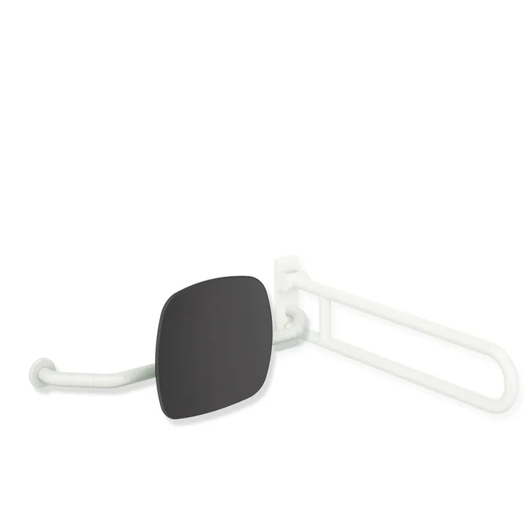 polyamide, high-polished, backrest made of synthetic material in HEWI colour 92 (anthracite grey), width 650 to 750 mm, 230 mm deep, backrest 334 mm high and 370 mm wide, rail diameter 33 mm, one-sided installation on the wall with roses (right), one-sided installation on hinged support rails or stationary support rails with wall plate (left)