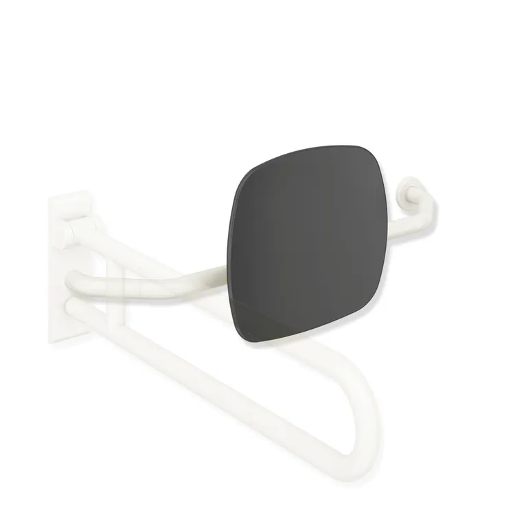 polyamide, high-polished, backrest made of synthetic material in HEWI colour 92 (anthracite grey), width 650 to 750 mm, 230 mm deep, backrest 334 mm high and 370 mm wide, rail diameter 33 mm, one-sided installation on the wall with roses (left), one-sided installation on HEWI hinged support rails or stationary support rails with wall plate (right)
