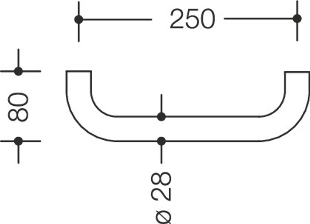 rail with right-angled ends without fixing roses, including non-corrosive HEWI fixing material, 250 mm wide (centre-to-centre), 80 mm deep and 28 mm in diameter, made of high-quality polyamide according to HEWI colour chart, including non-corrosive HEWI fixing material.