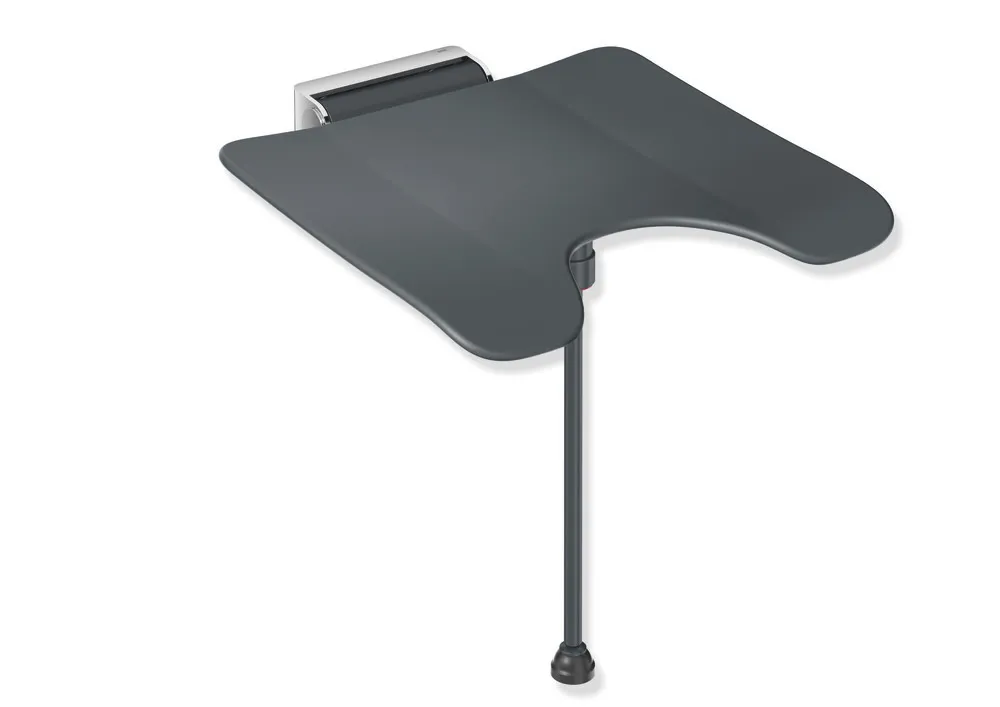 wall bracket made of stainless steel, chrome, chrome-plated, Seat made of textured plastic with hygiene cut-out, Seat 450 mm wide, 450 mm deep, with floor support for seat height 450-500 mm, powder coated in the colour of the seat, tested up to 200 kg when used with HEWI fixing material, Recommended maximum weight of the user: 150 kg, fulfils the DIN 18040 requirements, ÖNORM B1600/1601 and SIA 500.