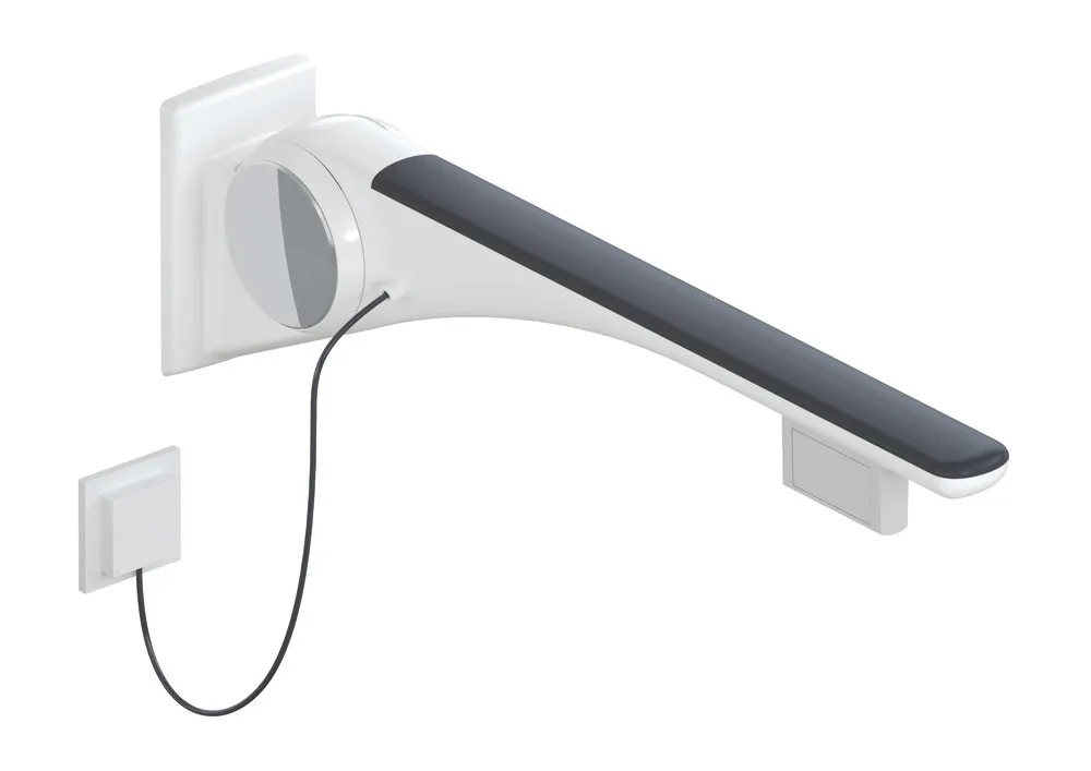 Aluminium cantilever, Powder-coated, glossy with plastic grip pad, with high-gloss chrome-plated design elements, High-quality plastic surface and scratch-resistant powder coating, Projection 700 mm, With function button (model E), right-hand version, Simple installation thanks to separate installation of the stainless steel mounting plate, matt polished, tested up to 150 kg when used with HEWI fixing material, Recommended maximum weight of the user: 150 kg, is produced in accordance with CE and UKCA Regulation (EU) 2017/745 on medical devices.