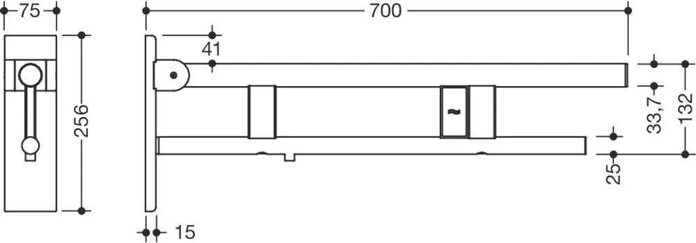 Show more Stainless steel, chrome-plated, Projection 700 mm, with flushing mechanism (model E), left-hand version, tested up to 150 kg when used with HEWI fixing material, Recommended maximum weight of the user: 150 kg, is produced in accordance with CE and UKCA Regulation (EU) 2017/745 on medical devices, fulfils the ÖNORM B1600/1601 and SIA 500 requirements.