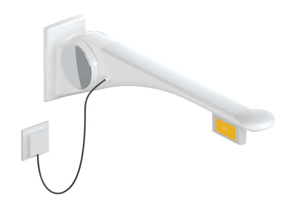 Show more Aluminium cantilever, Powder-coated, glossy with plastic grip pad with customised raised grip end piece, with high-gloss chrome-plated design elements, High-quality plastic surface and scratch-resistant powder coating, Projection 850 mm, With function button (model E), right-hand version, Simple installation thanks to separate installation of the stainless steel mounting plate, matt ground, tested up to 150 kg when used with HEWI fixing material, Recommended maximum weight of the user: 150 kg, is produced in accordance with CE and UKCA Regulation (EU) 2017/745 on medical devices, fulfils the DIN 18040 requirements, ÖNORM B1600/1601 and SIA 500.