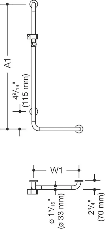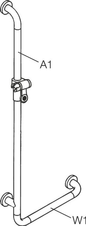 vertical and horizontal rails joined to form an L shape and fitted with rose fixings and a shower head holder, suitable for shower heads of various manufacturers, vertical length made-to-measure from 23 5/8 inch (600 mm) to 49 3/16 inch (1250 mm), horizontal lengths made-to-measure from 11 13/16 inch (300 mm) to 33 7/8 inch (850 mm), 2 3/4 inch (70 mm) deep, rail diameter 1 5/16 inch (33 mm), rose diameter 2 3/4 inch (70 mm), with continuous, corrosion resistant steel core, maximum loading capacity 330 lbs (150 kg), can be mounted in left hand or right hand position, made of high-quality polyamide in HEWI colours 99 (pure white), 95 (stone grey), 92 (anthracite grey), 90 (jet black), 86 (sand), 84 (umber) and 33 (ruby red), incl. non-corrosive HEWI fixing materials. Meets requirements according to 2010 ADA standards and ICC / ANSI A117.1-2017.