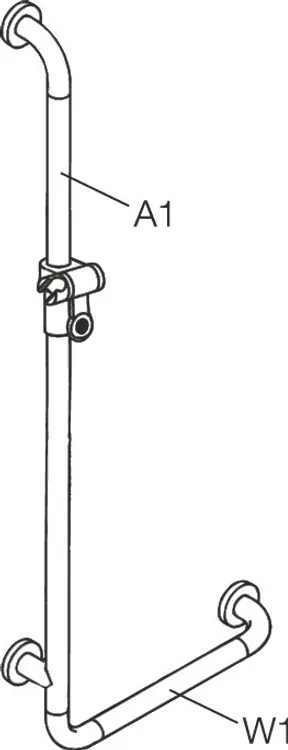 Show more vertical and horizontal rails joined to form an L shape and fitted with rose fixings and a shower head holder, suitable for shower heads of various manufacturers, vertical length made-to-measure from 23 5/8 inch (600 mm) to 49 3/16 inch (1250 mm), horizontal lengths made-to-measure from 11 13/16 inch (300 mm) to 33 7/8 inch (850 mm), 2 3/4 inch (70 mm) deep, rail diameter 1 5/16 inch (33 mm), rose diameter 2 3/4 inch (70 mm), with continuous, corrosion resistant steel core, maximum loading capacity 330 lbs (150 kg), can be mounted in left hand or right hand position, made of high-quality polyamide in HEWI colours 99 (pure white), 95 (stone grey), 92 (anthracite grey), 90 (jet black), 86 (sand), 84 (umber) and 33 (ruby red), incl. non-corrosive HEWI fixing materials. Meets requirements according to 2010 ADA standards and ICC / ANSI A117.1-2017.