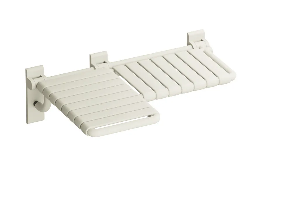 Show more design made from rails and seat elements, with corrosion-protected steel core throughout, wall plate made from synthetic material with integrated steel core, the narrow seating element is 18 1/8 inch (460 mm) wide and 15 1/16 inch (382 mm) deep, the protruding seat element is 13 9/16 inch (345 mm) wide and 22 3/4 inch (578 mm) deep, seat elements 2 3/16 inch (55 mm) wide, includes fixing material for mounting to cavity walls with wood backlining of two 2 inch x 16 inch laminate or hardwood boards connected with a 1/2 inch x 16 inch plywood board, made of high-quality matt polyamide in HEWI colours 99 (pure white), 95 (stone grey) and 92 (anthracite grey), meets the requirements of 2010 ADA standards and ICC/ANSI A117.1-2017.