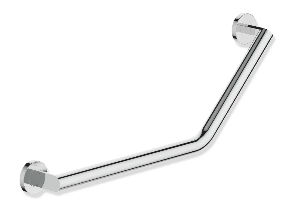 Show more made of high-quality stainless steel, chrome, rails joined at a flat angle with mounting roses, left-hand version, centre-to-centre 620 mm and 283 mm, angle 135°, 88 mm deep, rail diameter 32 mm, tube thickness 2 mm, rose diameter 70 mm, including non-corrosive HEWI fixing material.