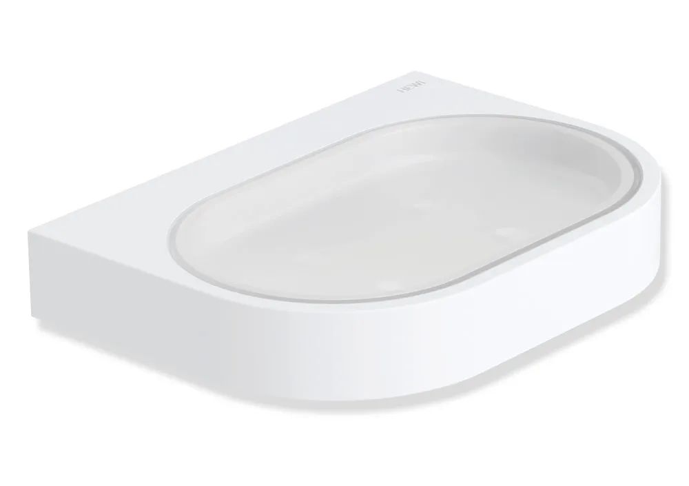 - holder made of metal, powder-coated in HEWI colour DC (deep matt black) and DX (deep matt white) with oval soap dish made from high-quality, satin-finish crystal glass