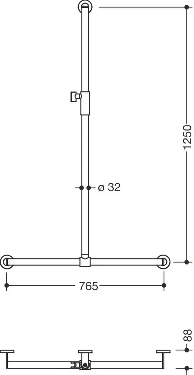 Stainless steel, matt ground, with continuously adjustable, magnetic shower holder made of stainless steel in the same colour as the shower rail, vertical length 1250 mm, horizontal length 765 mm, Diameter 32 mm, tested up to 200 kg when used with HEWI fixing material, Recommended maximum weight of the user: 150 kg.