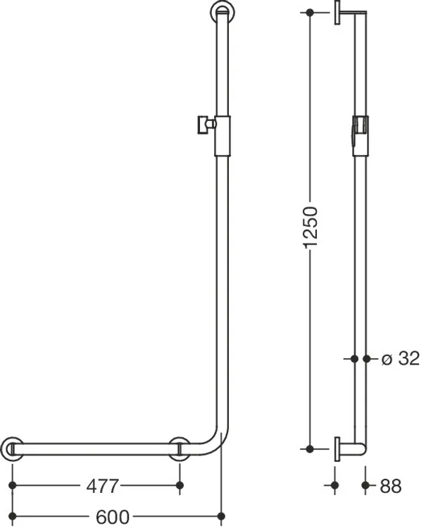 Show more stainless steel, PVD coated, Horizontal length 600 mm, vertical length 1250 mm, diameter 32 mm, left-hand version, with continuously adjustable, magnetic shower holder made of stainless steel in the same colour as the shower rail, tested up to 200 kg when used with HEWI fixing material, Recommended maximum weight of the user: 150 kg.