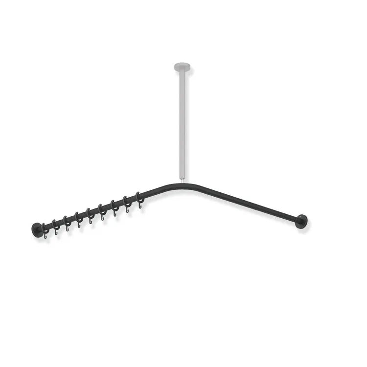 - made of high-quality stainless steel, powder-coated in HEWI colour DX (white deep matt) with 24 curtain rings made of white POM or powder-coated in HEWI colours DC (black deep matt) and SC (dark grey pearl mica deep matt) with 24 curtain rings made of black POM