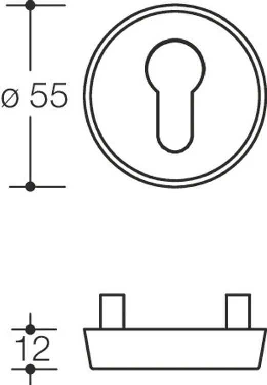 external rose, solid, Diameter 55 mm, 12 mm high, in conical version, as protection against violent twisting off, Additional anti-drilling protection, in the form of a drill protection plate measuring 32 mm x 74 mm. The anti-drilling protection plate must be fixed to the lock case, by gluing it, to the profile cylinder before mounting the lock. Internal rose, FS type in polyamide-steel composite, Diameter 55 mm, 10.5 mm high, concealed screw connection, for mounting in pairs, Delivery with M 5 screws, holes for profiled cylinder (Euro (PZ) and KABA), for cylinder projections: 9 - 15 mm.