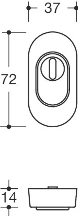 external rose, long stems, solid, oval 72 x 37 mm, 14 mm high, hardened, with integrated cylinder cover with supporting surround, in conical version, as protection against forced twisting off, holes for profiled cylinder (Euro (PZ)), for cylinder projections: 10.5 - 15 mm. The security escutcheon conforms to the requirements of DIN 18273., Surface satin finished, Supplied without screws.