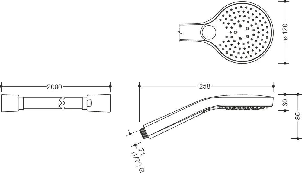 3-jet hand shower with shower hose made of synthetic material, colour matt black, jet type: Mix, Rain, Massage, hose length 2000 mm, hand shower tested to KTW and W270, shower hose tested to EN 1113 and KTW.