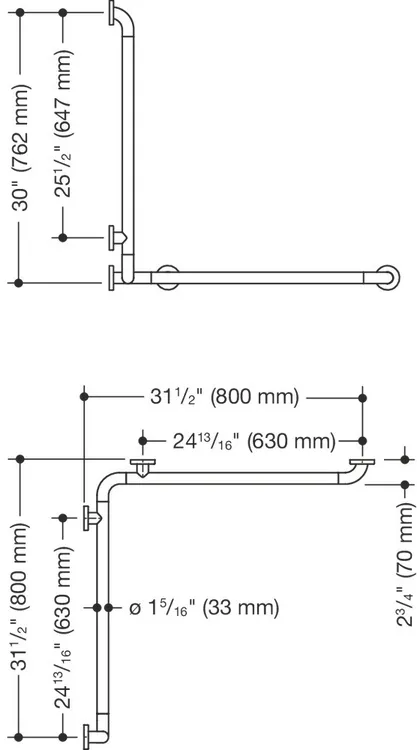 positioned horizontally and vertically, rails connected at a right angle with steel fixing roses, with corrosion-protected steel core throughout, vertical length 30 inch (762 mm), horizontal lengths 31 1/2 inch (800 mm), 2 3/4 inch (70 mm) deep, rail diameter 1 5/16 inch (33 mm), rose diameter 2 3/4 inch (70 mm), made from high-grade synthetic material in the HEWI colors 99 (pure white), 95 (stone gray), 92 (anthracite gray), 90 (jet black), 86 (sand), 84 (umber) and 33 (ruby red), meets the requirements of 2010 ADA standards and ICC/ANSI A117.1-2017.