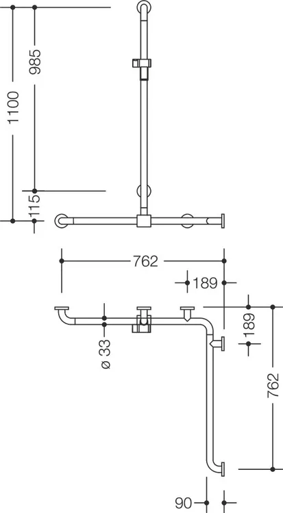 Stainless steel, matt polished, with infinitely adjustable shower head holder made of high-gloss polyamide in HEWI colours 90 (deep black), 92 (anthracite grey), 98 (signal white) or 99 (pure white), vertical length 1100 mm, horizontal lengths (corner mounting) 762 mm, diameter 33 mm, tested up to 200 kg when used with HEWI fixing material, Recommended maximum weight of the user: 150 kg.