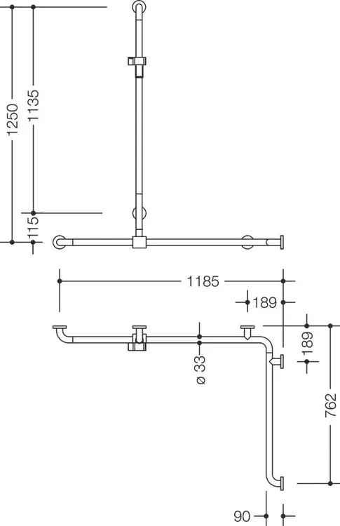 Stainless steel, matt polished, with infinitely adjustable shower head holder made of high-gloss polyamide in HEWI colours 90 (deep black), 92 (anthracite grey), 98 (signal white) or 99 (pure white), vertical length 1250 mm, horizontal lengths (corner mounting) 1185 mm and 762 mm, Diameter 33 mm, tested up to 200 kg when used with HEWI fixing material, Recommended maximum weight of the user: 150 kg.