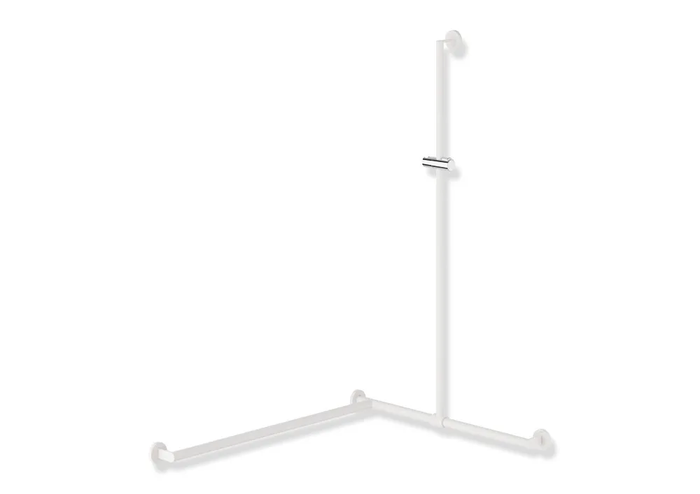 Show more Stainless steel, Powder-coated, with adjustable plastic shower head holder, chrome-plated, vertical length 1250 mm, horizontal lengths (corner mounting) 765 mm and 965 mm, Diameter 25 mm, left-hand version, tested up to 200 kg when used with HEWI fixing material, Recommended maximum weight of the user: 150 kg.