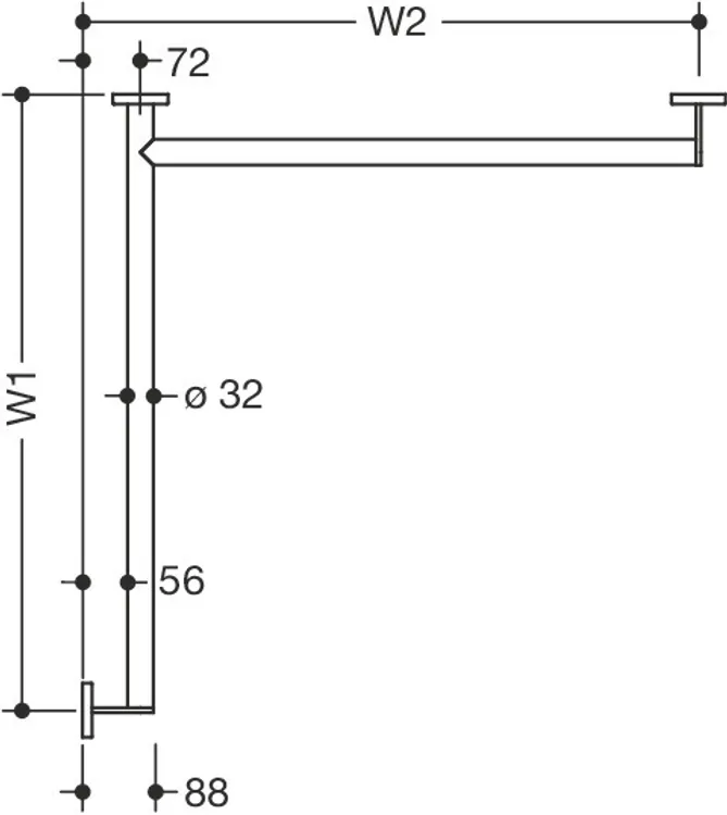 Show more made of high-quality stainless steel, satin, horizontally arranged rails with mounting roses, right-hand version, horizontal lengths made-to-measure from 475 mm to 1800 mm, 88 mm deep, rail diameter 32 mm, tube thickness 2 mm, rose diameter 70 mm, including HEWI fixing material.