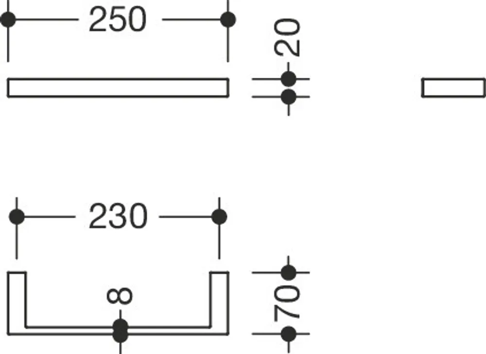 Show more stainless steel, powder coated, width 250 mm, height 20 mm, depth 70 mm.