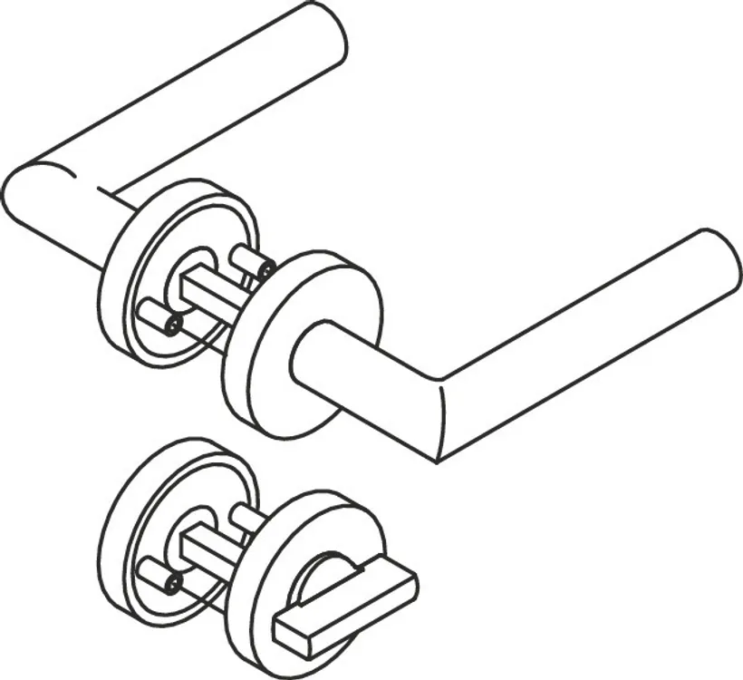 Roses: model 305.21X... and 306.23X..., 305.21X... composite synthetic material and steel rose substructure with black zinc/nickel surface for optimum corrosion protection, integrated spring-assisted restraining "hold-up" module, can be used for left or right-hand opening doors, supporting the lock for longer durability. Fixed rotating bearing of the lever handle with automatically latching all-round locking and 5 mm journal as maintenance-free plain bearing with elastic compensating area, to cancel the possible mounting inaccuracies. Concealed, non-loosening screwed joint with M5 stainless steel screw and sleeve combination as well as the pivot disappearing into the leaf. WC version with emergency opening by means of square spindle or coin and occupancy disc (red/white indicator) on the outside.
