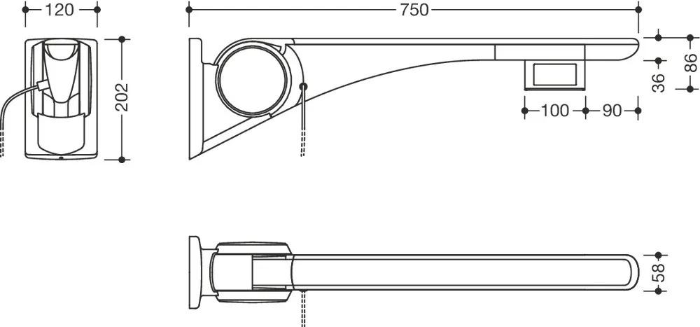 Afficher plus bras en aluminium, revêtu par poudre, brillant avec grip en matière synthétique, avec des éléments de design chromés brillants, surface en plastique de haute qualité et revêtement par poudre résistant aux rayures, saillie 750 mm, avec touche de fonction (version électrique), version droite, montage facile par l'installation séparée de la plaque de montage en acier inoxydable, brossé mat, testé jusqu'à 150 kg en utilisant le matériel de fixation HEWI, poids maximal recommandé pour l'utilisateur : 150 kg, est produit conformément au règlement CE et UKCA (UE) 2017/745 sur les dispositifs médicaux, répond aux exigences en vigueur en Belgique (CWATUPE, WVG Vlaanderen) en ce qui concerne la saillie de la barre d'appui rabattable sur les toilettes.