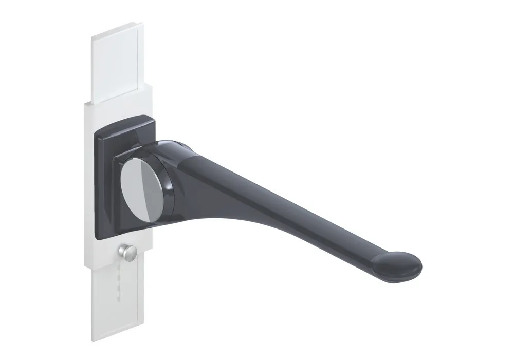 Afficher plus bras en aluminium, revêtu par poudre, brillant avec pad de préhension en plastique avec embout de préhension en relief adapté, avec des éléments de design chromés brillants, surface en plastique de haute qualité et revêtement par poudre résistant aux rayures, saillie 630 mm, avec réglage de la hauteur en aluminium, revêtu par poudre, montage simple grâce à l'installation séparée de la plaque réglable en hauteur, charge admissible jusqu'à 100 kg, est produit conformément au règlement (UE) 2017/745 relatif aux dispositifs médicaux.