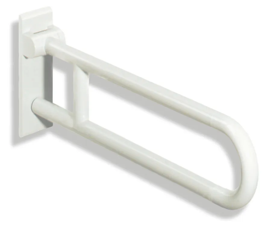 polyamide, brillant, saillie 750 mm, testé jusqu'à 150 kg en utilisant le matériel de fixation HEWI, poids maximal recommandé pour l'utilisateur : 150 kg, est produit conformément au règlement CE et UKCA (UE) 2017/745 sur les dispositifs médicaux, répond aux exigences en vigueur en Belgique (CWATUPE, WVG Vlaanderen) en ce qui concerne la saillie de la barre d'appui rabattable sur les toilettes.