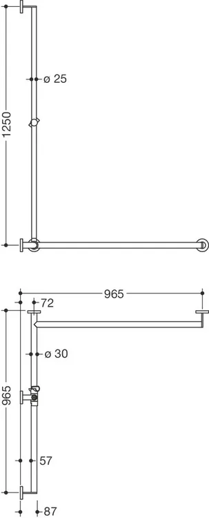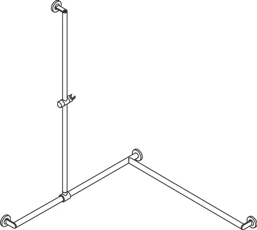 Acier inoxydable, chromé, avec support de douche réglable en plastique, chromé, longueur verticale 1250 mm, longueurs horizontales (montage en angle) 965 mm, diamètre 25 mm, version pour montage à droite, testé jusqu'à 200 kg en utilisant le matériel de fixation HEWI, poids maximal recommandé pour l'utilisateur : 150 kg.