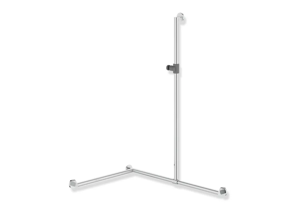en acier protégé contre la corrosion de haute qualité, chromé, barres verticales et horizontales avec rosaces de fixation et coulisseau de douche, avec barre avec coulisseau de douche réglable latéralement (pour le montage), version gauche, longueur verticale 1250 mm, longueurs horizontales (montage en angle) 947 mm et 647 mm, profondeur 70 mm, diamètre de barre 32 mm, épaisseur du tube 2 mm, diamètre de rosace de 70 mm, charge admissible jusqu'à 150 kg, support de douche en polyamide mat de haute qualité dans les couleurs HEWI 98 (blanc de sécurité) et 92 (gris anthracite), compatible avec les douchettes de différents fabricants, matériel de fixation anti-corrosion HEWI inclus, répond aux exigences des normes 2010 ADA et ICC/ANSI A117.1-2017
