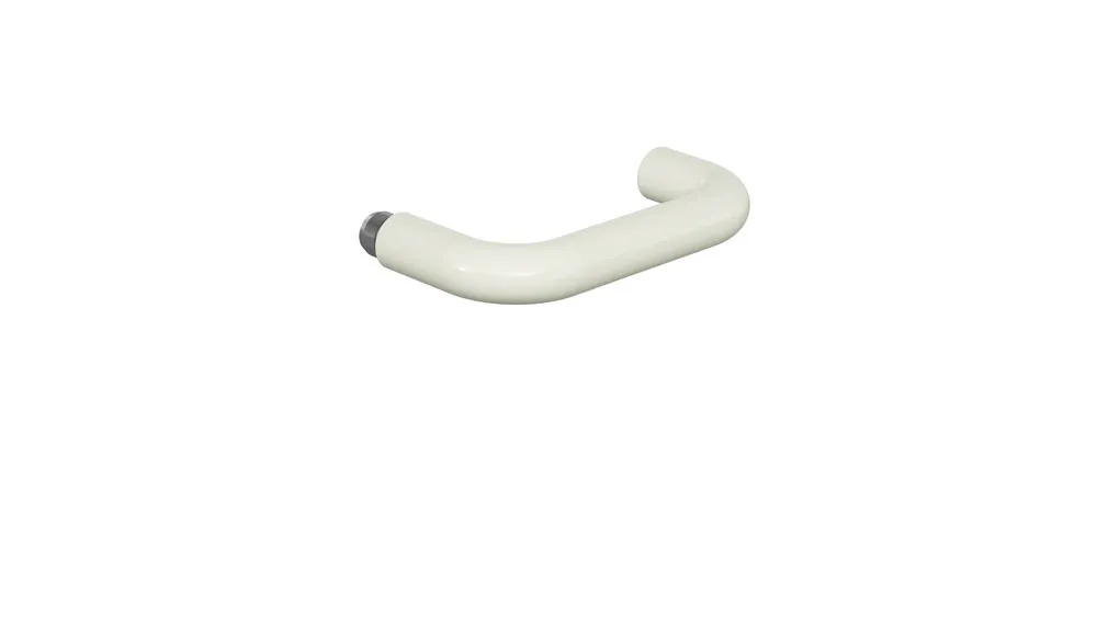 Béquille de porte 111R en forme de U en polyamide avec surface Softtouch et cœur d'acier anti-corrosion sur toute la longueur jusqu'à l'extrémité, teintée dans la masse, diamètre 20 mm, avec embout de guidage et rainure crantée. Montage par simple encliquetage des béquilles de porte dans les pièces de support prémontées sur la porte.