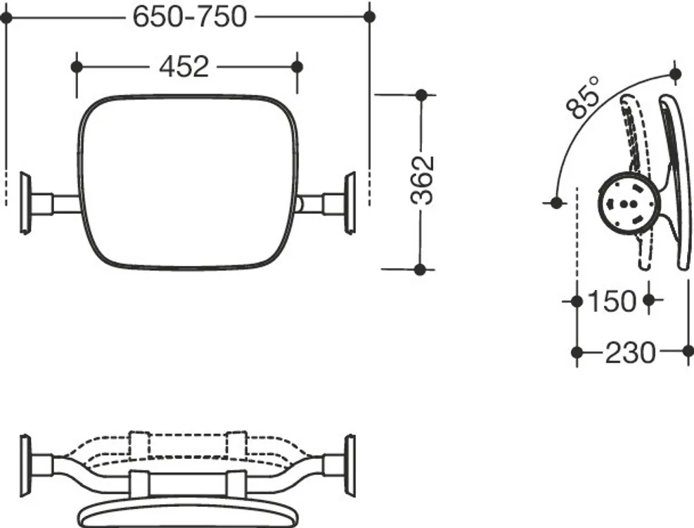 barre en acier inoxydable, recouvert de poudre dans les couleurs HEWI blanc de sécurité, brillant avec dossier en PUR dans la couleur HEWI SD (blanc de sécurité, mat) ou barre en anthracite, brillant avec dossier en DR (anthracite, mat), distance par rapport au mur réglable sur 150 mm (conforme à la norme) ou 230 mm (facile à utiliser) lors de l'installation, entraxe 650 à 750 mm, hauteur 362 mm, 150 ou 230 mm de profondeur, diamètre de barre 34 mm, dossier largeur 452 mm , 85° d'inclinaison, pour montage ultérieur facile sur barre d'appui relevable 802.50..., satisfait aux exigences des normes DIN 18040 et ÖNORM B1600/1601