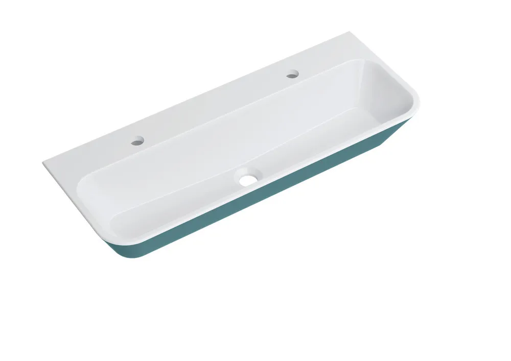 particulièrement bien adapté aux crèches et garderies, en fonte minérale avec surface non poreuse, bicolore : blanc alpin et couleur HEWI 74 (vert pomme) ou blanc alpin et couleur HEWI 55 (bleu aqua), sans trop-plein, préparé pour robinetterie à un trou, lavabo sans trou de robinet disponible sur demande sans supplément de prix (délai de livraison : env. 4 semaines), largeur 900 mm et profondeur 350 mm, charge admissible selon EN 14688, température élevée de l'eau : résistant aux changements jusqu'à 65 °C, résiste à une température de 80 °C pendant une durée de 5 minutes, marquage CE et UKCA selon la directive sur les produits de construction n° 305/2011.
