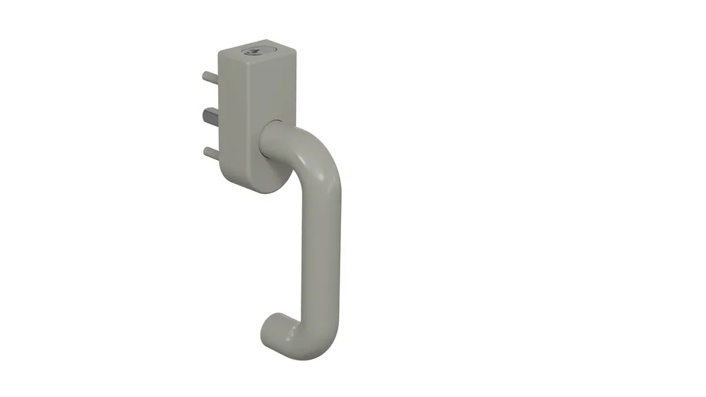 verrouillable, Modèle 116 en polyamide, diamètre 20 mm, 120 mm de long, avec crans de 90 degrés et tige carrée de 7 mm, longueur 30 mm en saillie (autres longueurs et 45 degrés de verrouillage sur demande). La poignée de fenêtre est conforme aux prescriptions de la norme DIN 18040.