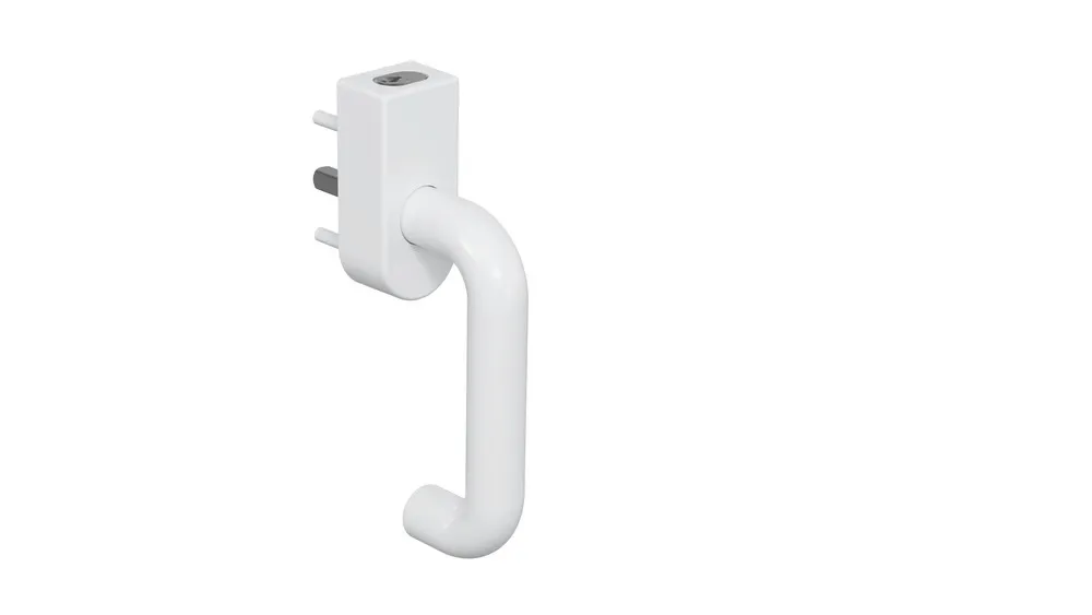 verrouillable, Modèle 116 en polyamide, diamètre 20 mm, 120 mm de long, avec crans de 90 degrés et tige carrée de 7 mm, longueur 30 mm en saillie (autres longueurs et 45 degrés de verrouillage sur demande). La poignée de fenêtre est conforme aux prescriptions de la norme DIN 18040.