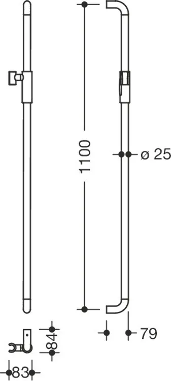 Afficher plus acier inoxydable, peint par poudrage, entraxe 1100 mm, profondeur 79 mm, diamètre 25 mm, avec un réglage en continu, coulisseau de douche magnétique en acier inoxydable peint par poudrage dans la couleur de la barre de douche.