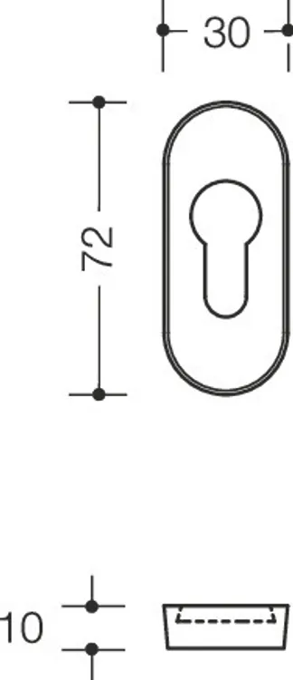 en acier inoxydable surface brossée mate avec cache-cylindre, rosace extérieure, massif, ovale 72 x 30 mm, hauteur 10 mm, rosace intérieure version FS en construction composite polyamide -acier, ovale 72 x 30 mm, hauteur 10,5 mm, entrées de clé pour cylindre profilé (PZ), pour les dépassements de cylindre : 10,5 - 15 mm, la rosace antivol HEWI est conforme aux prescriptions de la norme DIN 18273