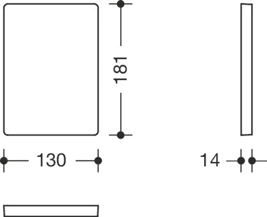 - 130 mm breed, 181 mm hoog, 14 mm diep