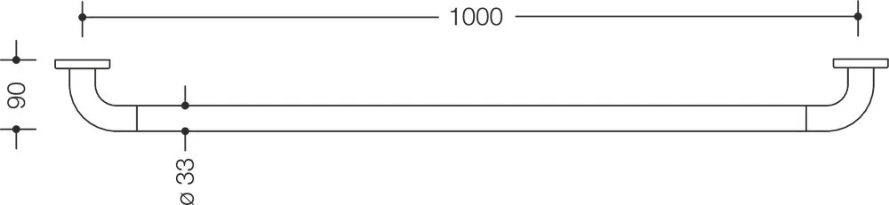 aan de uiteinden in een rechte hoek afgebogen stang met bevestigingsrozetten, met corrosiebestendig stalen inzetstuk, 1000 mm breed (asmaat), 90 mm diep en 33 mm in diameter, rozetdiameter 70 mm, van hoogwaardige polyamide door HEWI kleurentabel, inclusief corrosievrij HEWI bevestigingsmateriaal.