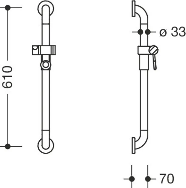 aan de uiteinden in een rechte hoek afgebogen verticale stang met stalen bevestigingsrozetten en douchekophouder, geschikt voor douchekoppen van verschillende fabrikanten, met doorlopende, tegen corrosie beschermde stalen kern, asafstand 24" (610 mm), 2 3/4 inch (70 mm) diep, stangdiameter 1 5/16 inch (33 mm), diameter rozet 2 3/4 inch (70 mm), maximale belastbaarheid 330 lbs (150 kg), van hoogwaardige polyamide in de HEWI kleuren 99 ( zuiverwit), 95 (rotsgrijs), 92 (antracietgrijs), 90 (diepzwart), 86 (zand), 84 (omber) en 33 (robijnrood), voldoet aan de eisen conform 2010 ADA-normen en ICC/ANSI A117.1-2017