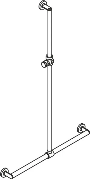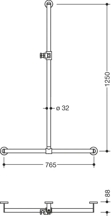 Roestvrij staal, gepoedercoat, met traploos verstelbare douchekophouder van mat polyamide, verticale lengte 1250 mm, horizontale lengtes 765 mm, Diameter 32 mm, getest tot 200 kg bij gebruik met HEWI-bevestigingsmateriaal, Aanbevolen maximaal gewicht van de gebruiker: 150 kg.