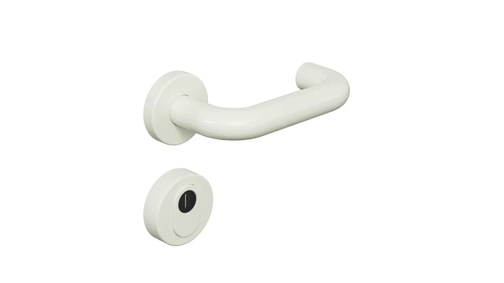 in R-techniek met rozetten conform DIN 18255 en EN 1906 van polyamide, hoogglans, beschermingsklasse ES 1 volgens DIN 18257, deurkruk 111R van polyamide met doorlopende stalen kern, diameter 20 mm rozet 305.20R, rond, van polyamide. diameter 55 mm, 10,5 mm hoog. veiligheids-sleutelrozet 306.23ESZRC, in polyamide-staalcombinatie met cilinderbescherming, buitendiameter rozet 58 mm, 16 mm hoog, gehard onderdeel, diameter binnenrozet 55 mm, 10,5 mm hoog, de veiligheids-sleutelrozet voldoet aan de eisen van DIN 18273